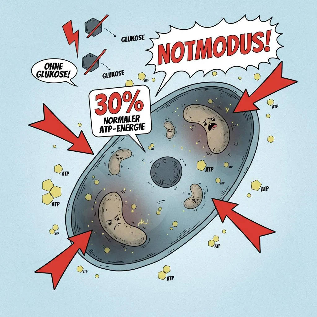 Ohne Glucose schalten Ihre Zellkraftwerke in den Notmodus. Mitochondrien produzieren nur noch 30% der normalen ATP-Energie. Sie werden müde, schwach, depressiv - während Ihr Blutzucker durch die Decke schießt.