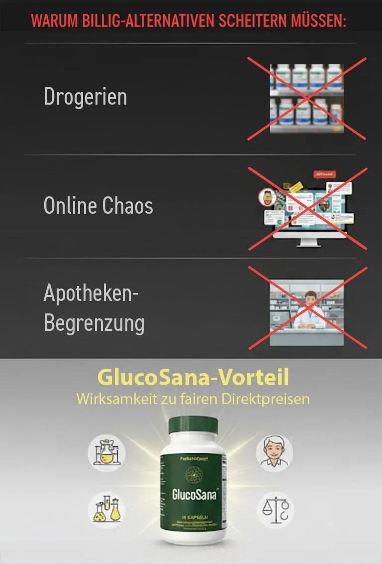 Rechtlicher Hinweis: GlucoSana ist ein Nahrungsergänzungsmittel und kein Ersatz für eine ausgewogene Ernährung und gesunde Lebensweise. Die dargestellten Ergebnisse basieren auf internationalen Universitätsstudien und individuellen Erfahrungsberichten. Individuelle Ergebnisse können variieren. Bei gesundheitlichen Problemen konsultieren Sie Ihren Arzt. GlucoSana ersetzt keine ärztliche Behandlung, kann diese aber sinnvoll ergänzen. Medikamenten-Änderungen nur unter ärztlicher Aufsicht. Aussagen zu Nahrungsergänzungsmitteln wurden nicht von der EFSA bewertet.